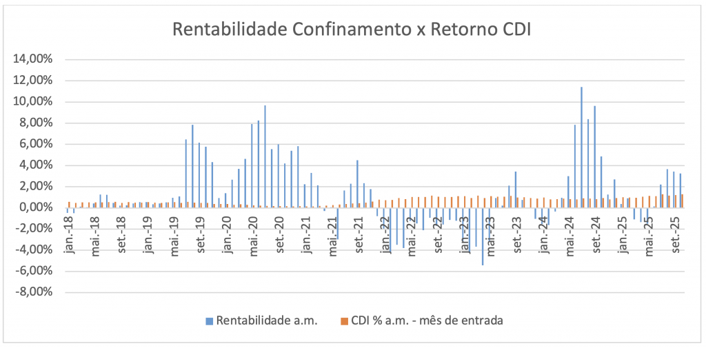 Nos últimos anos, a rentabilidade média oscilou de -17,7%, no ano de 2023, até mais de 46% no ano passado, mostrando, sim, uma alta volatilidade, explicada pelos preços dos insumos (grãos e boi magro) e, também, pelo valor de venda do boi gordo. Por sua vez, o retorno médio mensal do confinamento ao longo de 2018 a 2025 oscilou de -1,7% a 15,4%, trazendo um cenário interessante sob a ótica de investimentos.